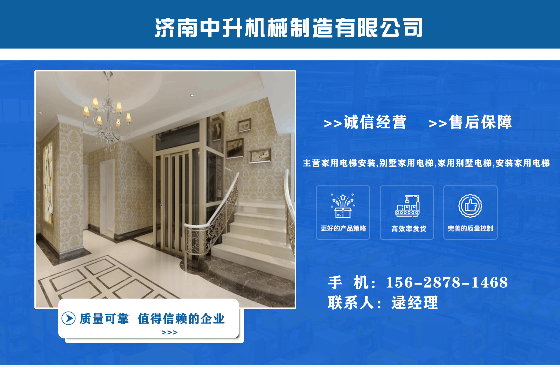 濟(jì)南中升機(jī)械制造有限公司主營(yíng)家用電梯安裝,別墅家用電梯,家用別墅電梯,安裝家用電梯等業(yè)務(wù),質(zhì)量可靠,值得信賴!  公司為客戶提供免費(fèi)上門測(cè)量,根據(jù)實(shí)際情況1對(duì)1服務(wù),保障符合用戶需求,終身提供售后服務(wù),讓用戶買的舒心用的放心。匠心團(tuán)隊(duì),打造信賴產(chǎn)品,我們有團(tuán)結(jié)、奮進(jìn)拼搏的匠心團(tuán)隊(duì),為您提供可信賴的品質(zhì)保證。  從創(chuàng)立以來(lái)一直嚴(yán)格執(zhí)行質(zhì)量管理體系、環(huán)境管理體系等相關(guān)標(biāo)準(zhǔn)管理體系,“顧客滿意”是我們始終如一的追求。我們有屬于自己培養(yǎng)的安裝隊(duì)伍,24小時(shí)服務(wù)電話,為您提供可靠的服務(wù)與支持。  我們的愿景是建設(shè)國(guó)內(nèi)具有影響力的電梯公司,做城市美好空間的好伙伴。...